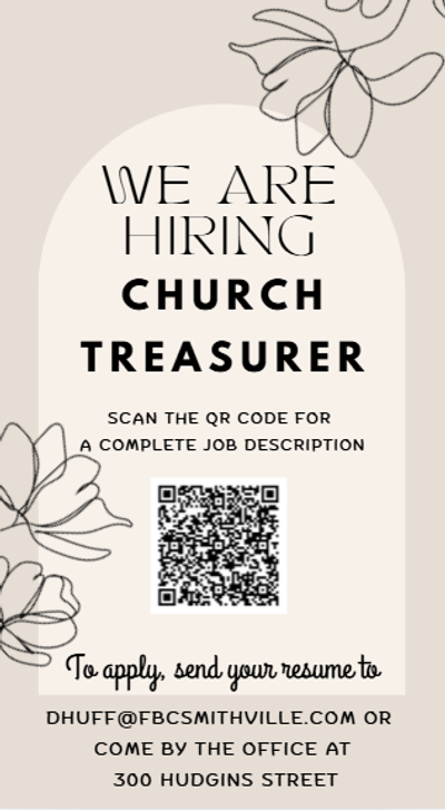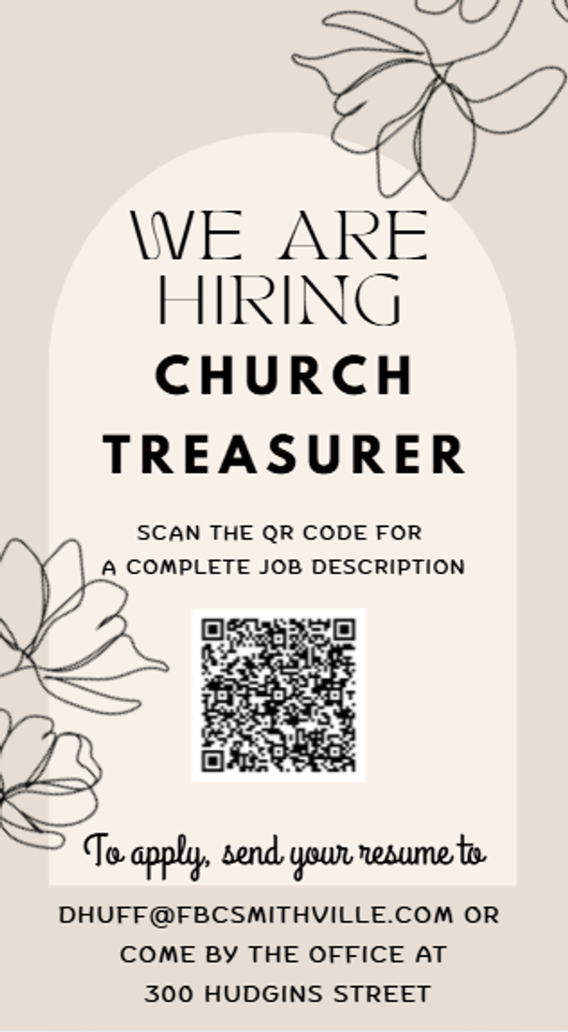 FBC is looking to hire a FBC Member as Church Treasurer. Please SCAN the QR code for a complete job description. If interested in the position, please submit your resume to Pastor Huff at dhuff@fbcsmithville.com or come by the church office at 300 Hudgins Street.